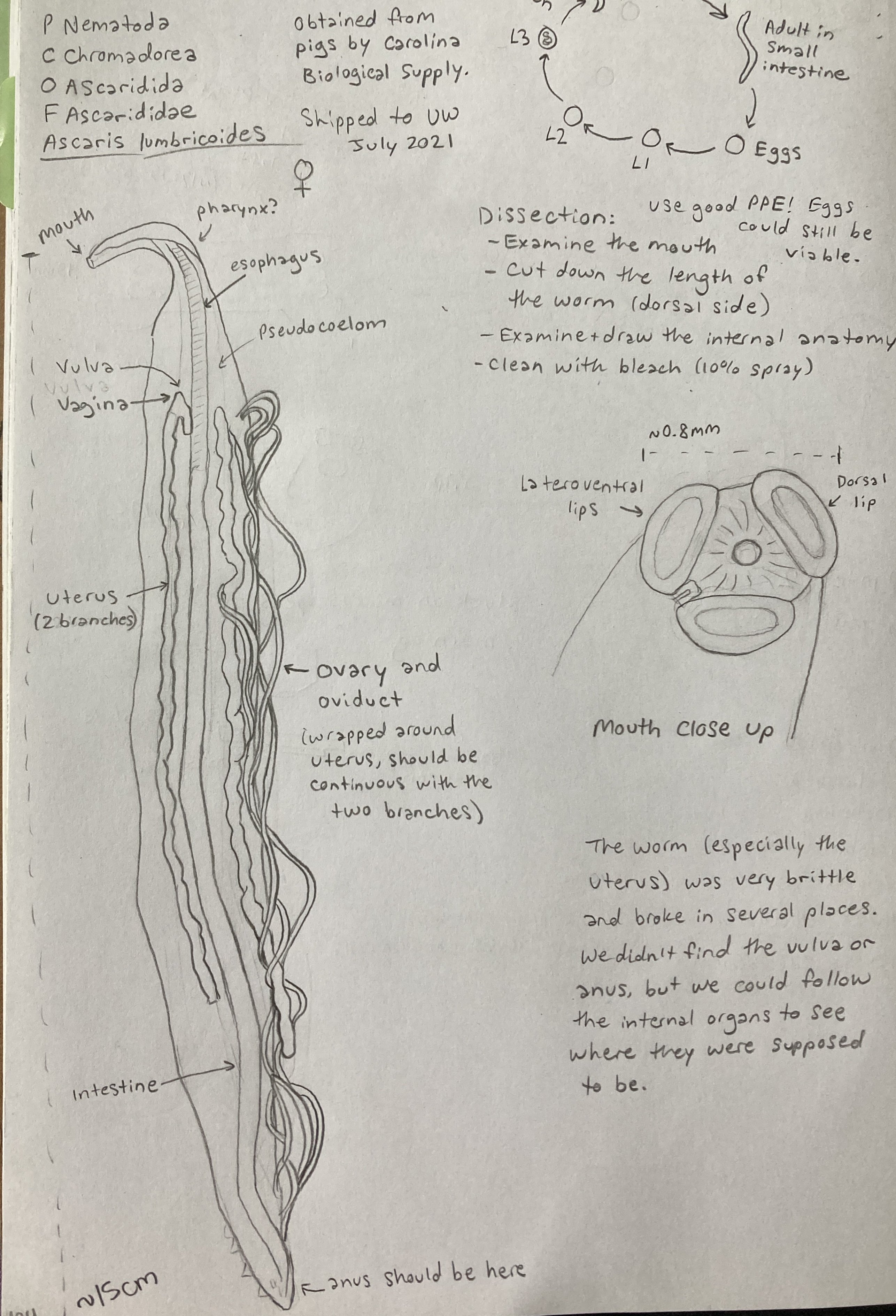 You’ve now seen at least a few nematodes from your fish dissection. This week, we will take a deep dive into this fascinating clade of parasites. You will come face-to-face with a disturbingly large (but thankfully dead) human-infecting nematode and some living insect-infecting nematodes. Remember to keep careful track of your observations in your lab notebook and make sure to finish reading the entire Lab 5 overview before your lab section meets!