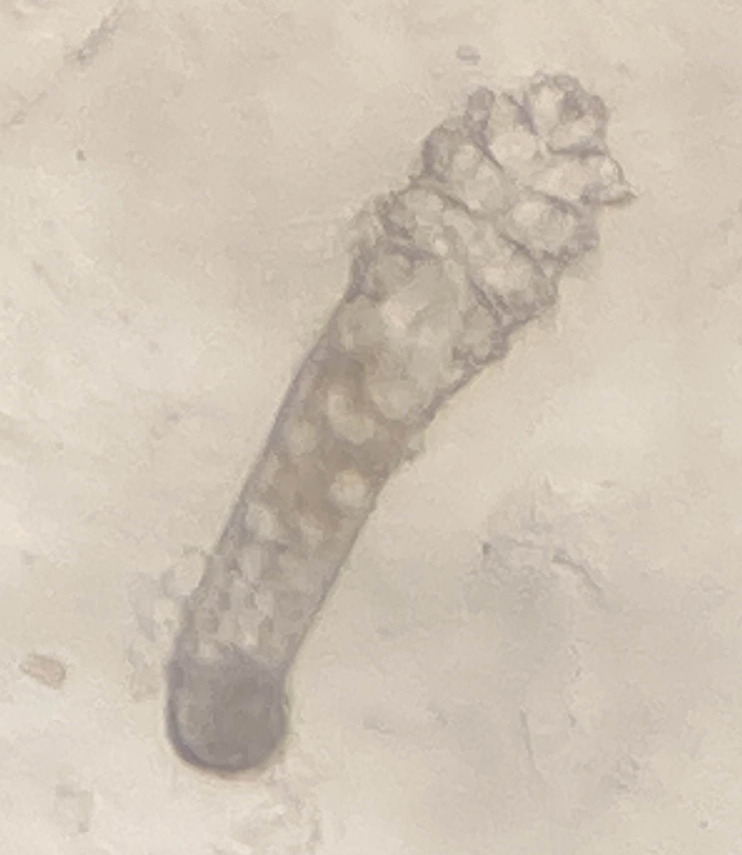 Schistosome cercariae are fork-tailed. Once released from their snail hosts, they swim through the water column, seeking out a vertebrate definitive host. In the case of Schistosoma mansoni and Schistosoma haematobium, the definitive hosts are human, and they infect human hosts by penetrating the skin of people bathing in streams, rivers, lakes, and ponds containing snails. In lab, you will see only the adult and egg stages of this parasite, not the cercariae (even though the Wood Lab does keep living schistosome cercariae in its biosafety-level 2 facility). Why am I not giving you schistosome cercariae to handle?